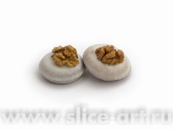 Сдобное печенье в форме бублика в белой глазури с грецким орехом.